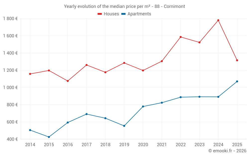The median price on the 22 apartment transactions of the last 12 months in the municipality of Cornimont was 1 058 € per square meter for a median property value of 80 500 €. Over this period, 60% of transactions were between 650 and 1 267 € per square meter (from the 2nd to the 8th deciles).