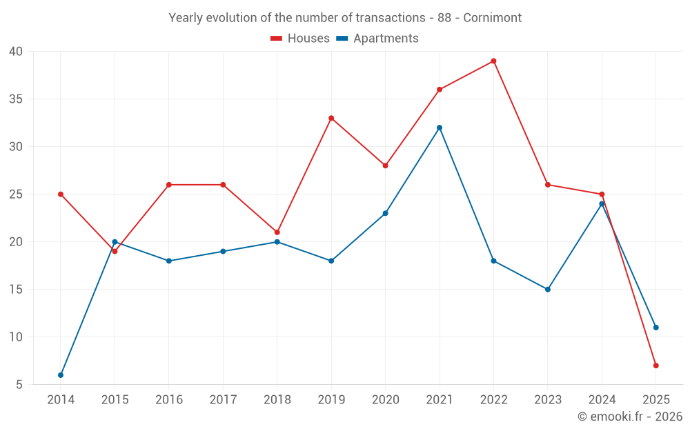 The median price on the 21 house transactions of the last 12 months in the municipality of Cornimont was 1 563 € per square meter for a median property value of 151 000 €. Over this period, 60% of transactions were between 1 228 and 2 182 € per square meter (from the 2nd to the 8th deciles).