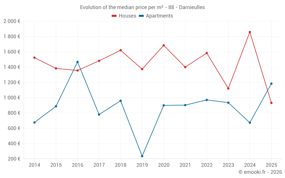The median price on the 19 house transactions of the last 24 months in the municipality of Darnieulles was 1 547 € per square meter for a median property value of 175 000 €. Over this period, 60% of transactions were between 1 039 and 1 915 € per square meter (from the 2nd to the 8th deciles).