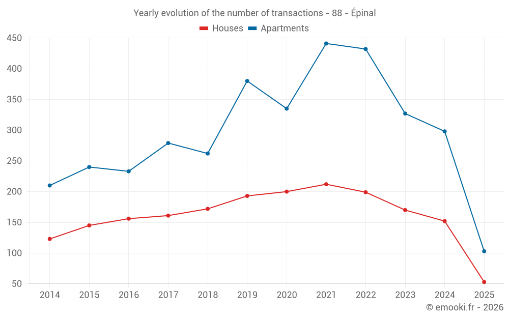 The median price on the 53 house transactions of the last 6 months in the municipality of Épinal was 1 916 € per square meter for a median property value of 185 000 €. Over this period, 60% of transactions were between 1 476 and 2 287 € per square meter (from the 2nd to the 8th deciles).
