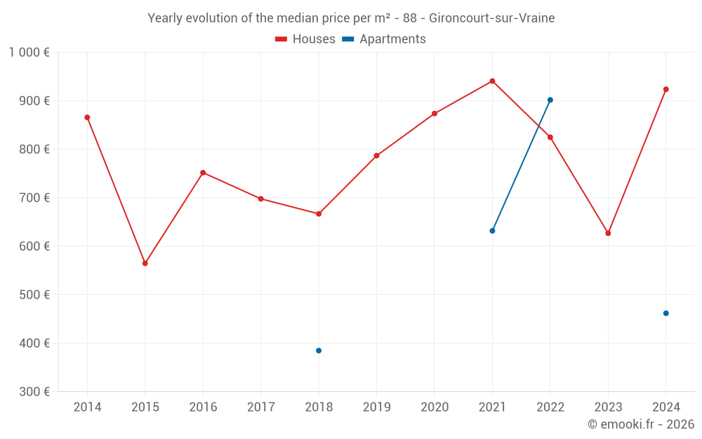 The median price on the 22 house transactions of the last 24 months in the municipality of Gironcourt-sur-Vraine was 718 € per square meter for a median property value of 80 000 €. Over this period, 60% of transactions were between 398 and 1 235 € per square meter (from the 2nd to the 8th deciles).