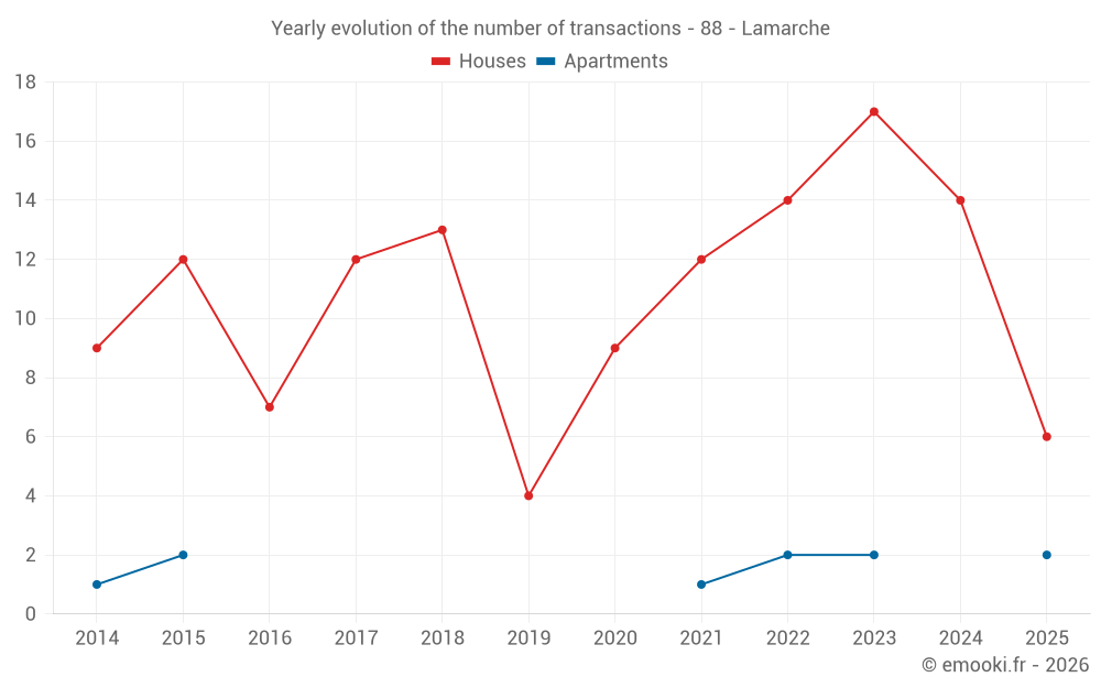 The median price on the 32 house transactions of the last 24 months in the municipality of Lamarche was 414 € per square meter for a median property value of 39 500 €. Over this period, 60% of transactions were between 169 and 968 € per square meter (from the 2nd to the 8th deciles).