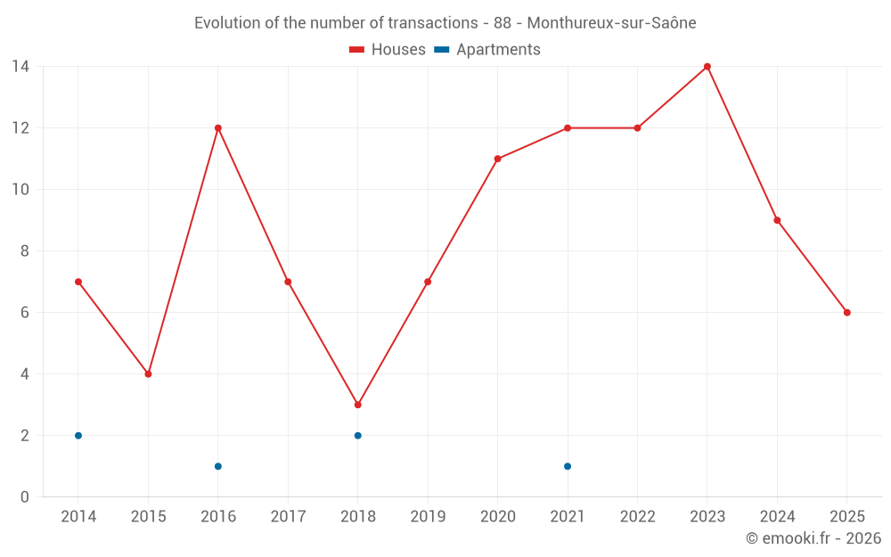 The median price on the 22 house transactions of the last 24 months in the municipality of Monthureux-sur-Saône was 504 € per square meter for a median property value of 51 000 €. Over this period, 60% of transactions were between 257 and 841 € per square meter (from the 2nd to the 8th deciles).