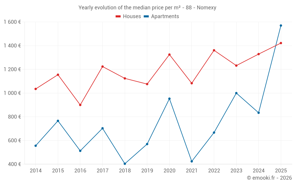 The median price on the 16 house transactions of the last 12 months in the municipality of Nomexy was 1 438 € per square meter for a median property value of 161 250 €. Over this period, 60% of transactions were between 963 and 1 818 € per square meter (from the 2nd to the 8th deciles).
