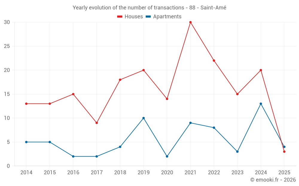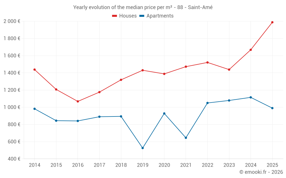 The median price on the 29 house transactions of the last 24 months in the municipality of Saint-Amé was 1 623 € per square meter for a median property value of 169 000 €. Over this period, 60% of transactions were between 1 136 and 2 013 € per square meter (from the 2nd to the 8th deciles).