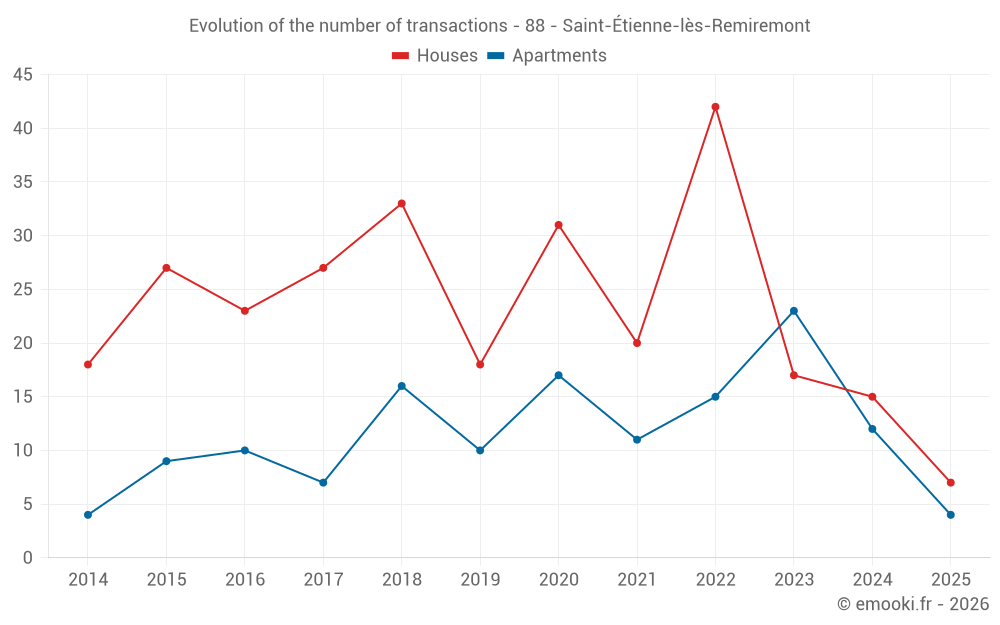 The median price on the 17 house transactions of the last 12 months in the municipality of Saint-Étienne-lès-Remiremont was 1 694 € per square meter for a median property value of 178 000 €. Over this period, 60% of transactions were between 1 324 and 1 814 € per square meter (from the 2nd to the 8th deciles).