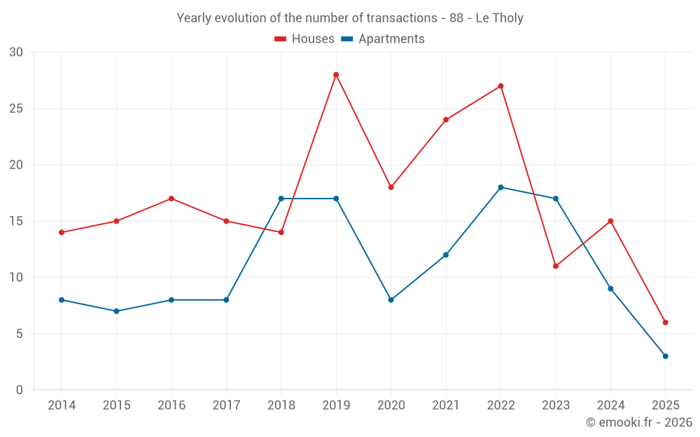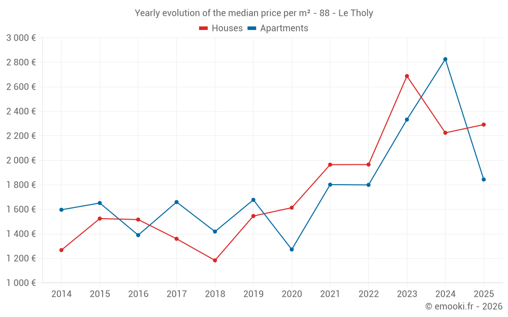 The median price on the 26 house transactions of the last 24 months in the municipality of Le Tholy was 2 370 € per square meter for a median property value of 203 900 €. Over this period, 60% of transactions were between 1 941 and 2 851 € per square meter (from the 2nd to the 8th deciles).