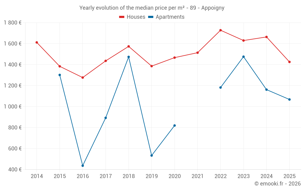 The median price on the 32 house transactions of the last 12 months in the municipality of Appoigny was 1 513 € per square meter for a median property value of 145 075 €. Over this period, 60% of transactions were between 1 133 and 2 045 € per square meter (from the 2nd to the 8th deciles).