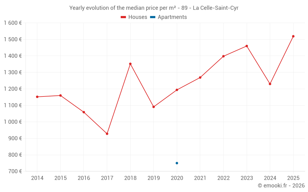 The median price on the 29 house transactions of the last 24 months in the municipality of La Celle-Saint-Cyr was 1 403 € per square meter for a median property value of 125 000 €. Over this period, 60% of transactions were between 940 and 2 021 € per square meter (from the 2nd to the 8th deciles).