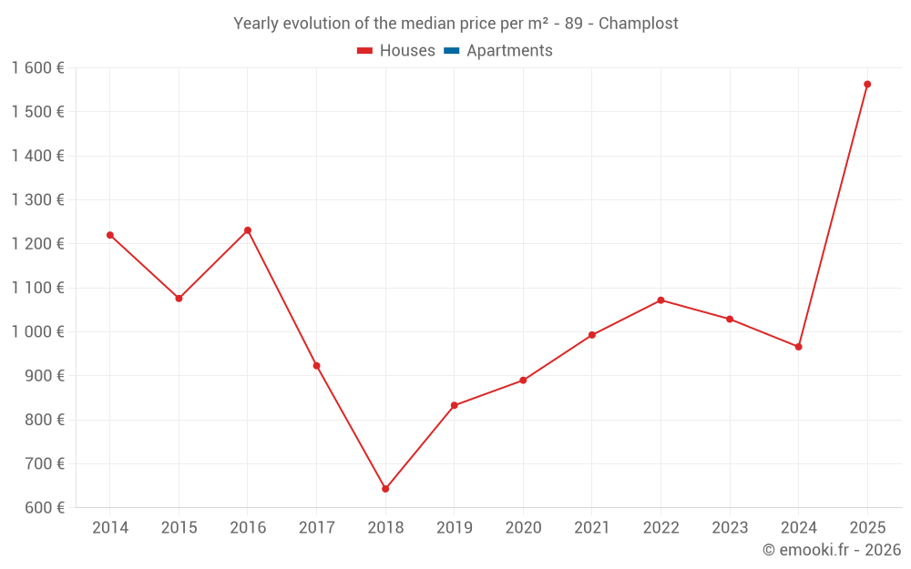 The median price on the 26 house transactions of the last 24 months in the municipality of Champlost was 933 € per square meter for a median property value of 90 500 €. Over this period, 60% of transactions were between 438 and 1 563 € per square meter (from the 2nd to the 8th deciles).