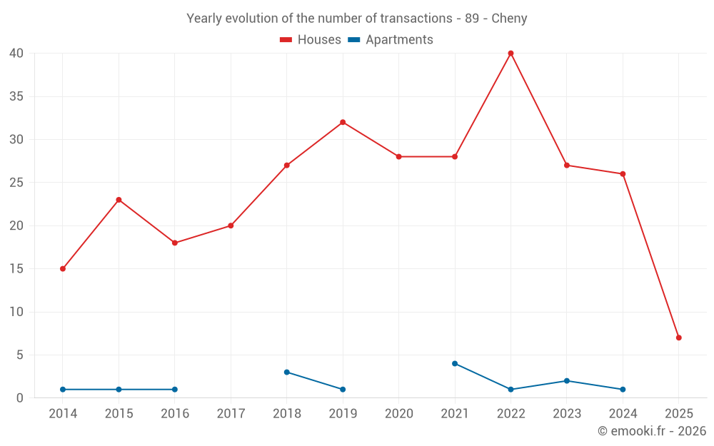 The median price on the 20 house transactions of the last 12 months in the municipality of Cheny was 1 344 € per square meter for a median property value of 123 385 €. Over this period, 60% of transactions were between 1 149 and 1 657 € per square meter (from the 2nd to the 8th deciles).