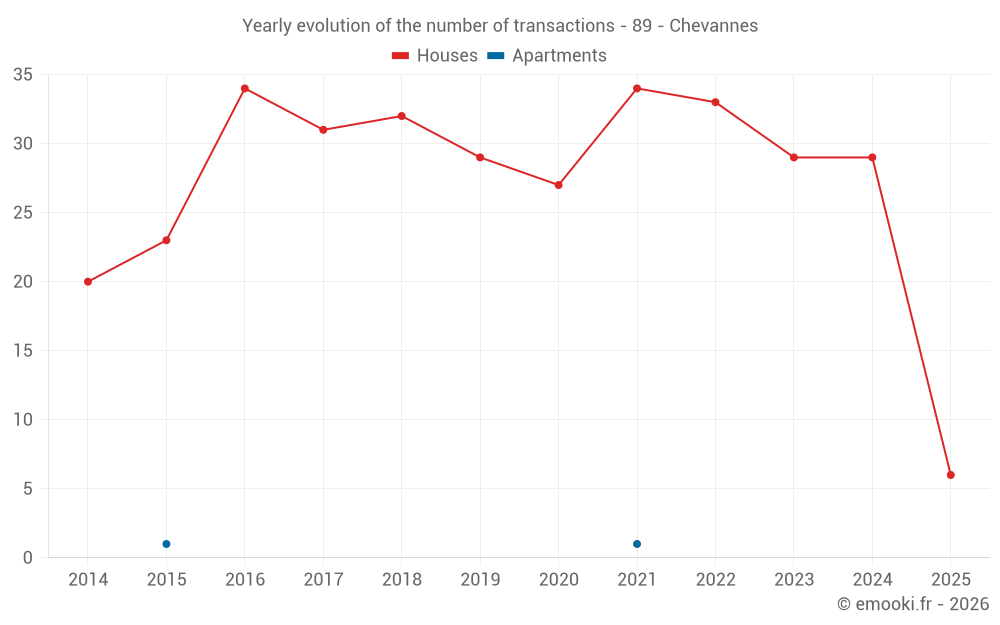 The median price on the 21 house transactions of the last 12 months in the municipality of Chevannes was 1 500 € per square meter for a median property value of 143 000 €. Over this period, 60% of transactions were between 1 164 and 1 964 € per square meter (from the 2nd to the 8th deciles).