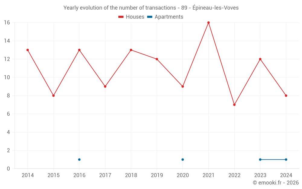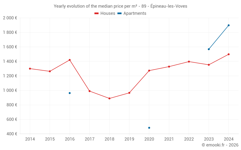 The median price on the 17 house transactions of the last 24 months in the municipality of Épineau-les-Voves was 1 418 € per square meter for a median property value of 116 000 €. Over this period, 60% of transactions were between 1 145 and 1 972 € per square meter (from the 2nd to the 8th deciles).