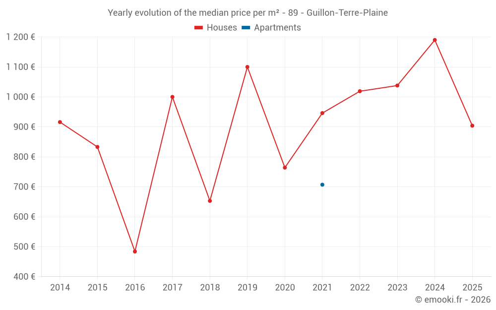 The median price on the 14 house transactions of the last 24 months in the municipality of Guillon-Terre-Plaine was 1 101 € per square meter for a median property value of 104 000 €. Over this period, 60% of transactions were between 773 and 1 457 € per square meter (from the 2nd to the 8th deciles).