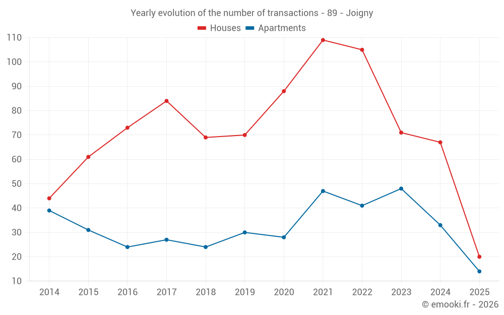 The median price on the 20 house transactions of the last 6 months in the municipality of Joigny was 1 248 € per square meter for a median property value of 92 000 €. Over this period, 60% of transactions were between 1 019 and 1 581 € per square meter (from the 2nd to the 8th deciles).
