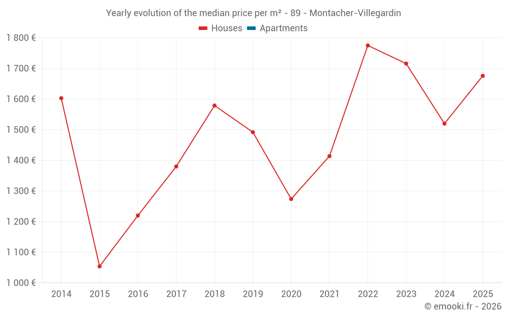 The median price on the 20 house transactions of the last 24 months in the municipality of Montacher-Villegardin was 1 651 € per square meter for a median property value of 150 825 €. Over this period, 60% of transactions were between 1 075 and 1 945 € per square meter (from the 2nd to the 8th deciles).