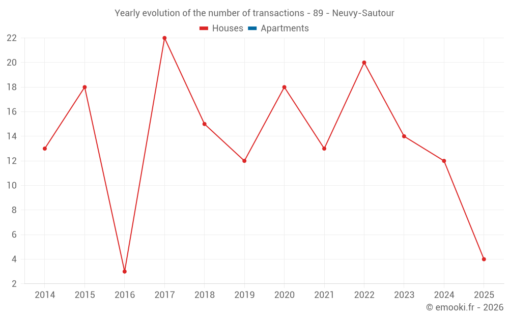 The median price on the 25 house transactions of the last 24 months in the municipality of Neuvy-Sautour was 950 € per square meter for a median property value of 122 000 €. Over this period, 60% of transactions were between 694 and 1 489 € per square meter (from the 2nd to the 8th deciles).
