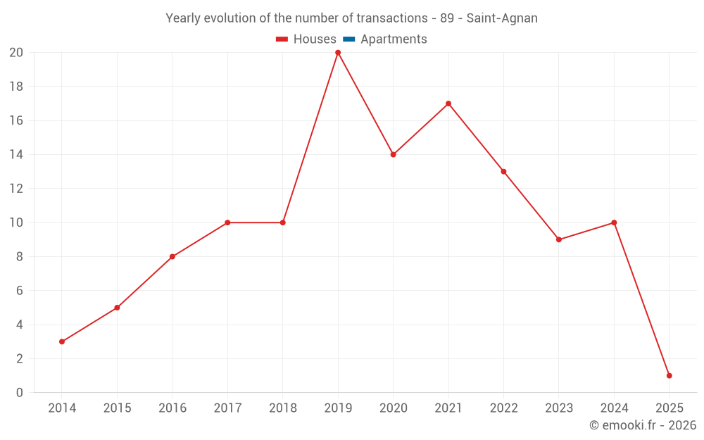 The median price on the 14 house transactions of the last 24 months in the municipality of Saint-Agnan was 1 556 € per square meter for a median property value of 150 000 €. Over this period, 60% of transactions were between 1 052 and 1 965 € per square meter (from the 2nd to the 8th deciles).