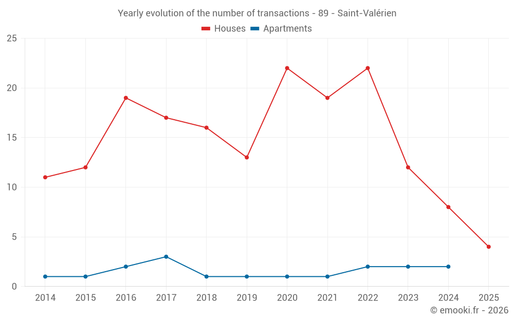 The median price on the 20 house transactions of the last 24 months in the municipality of Saint-Valérien was 1 539 € per square meter for a median property value of 123 500 €. Over this period, 60% of transactions were between 1 133 and 1 805 € per square meter (from the 2nd to the 8th deciles).