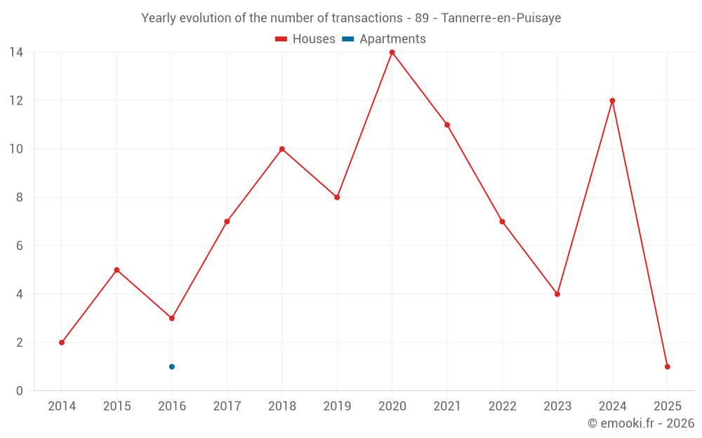 The median price on the 15 house transactions of the last 24 months in the municipality of Tannerre-en-Puisaye was 1 033 € per square meter for a median property value of 95 000 €. Over this period, 60% of transactions were between 741 and 1 804 € per square meter (from the 2nd to the 8th deciles).