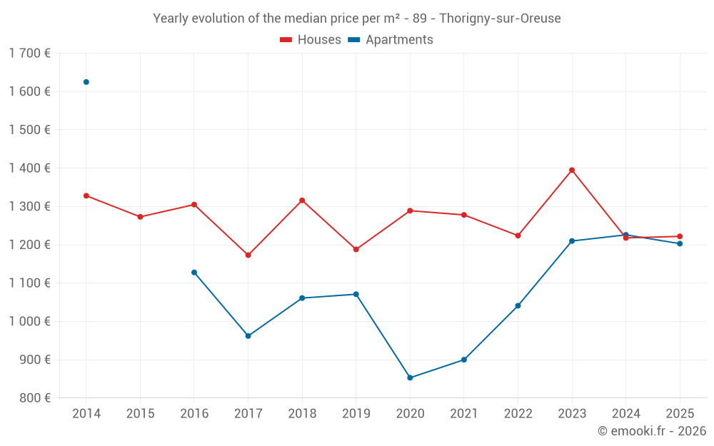 The median price on the 26 house transactions of the last 12 months in the municipality of Thorigny-sur-Oreuse was 1 217 € per square meter for a median property value of 97 500 €. Over this period, 60% of transactions were between 889 and 1 418 € per square meter (from the 2nd to the 8th deciles).