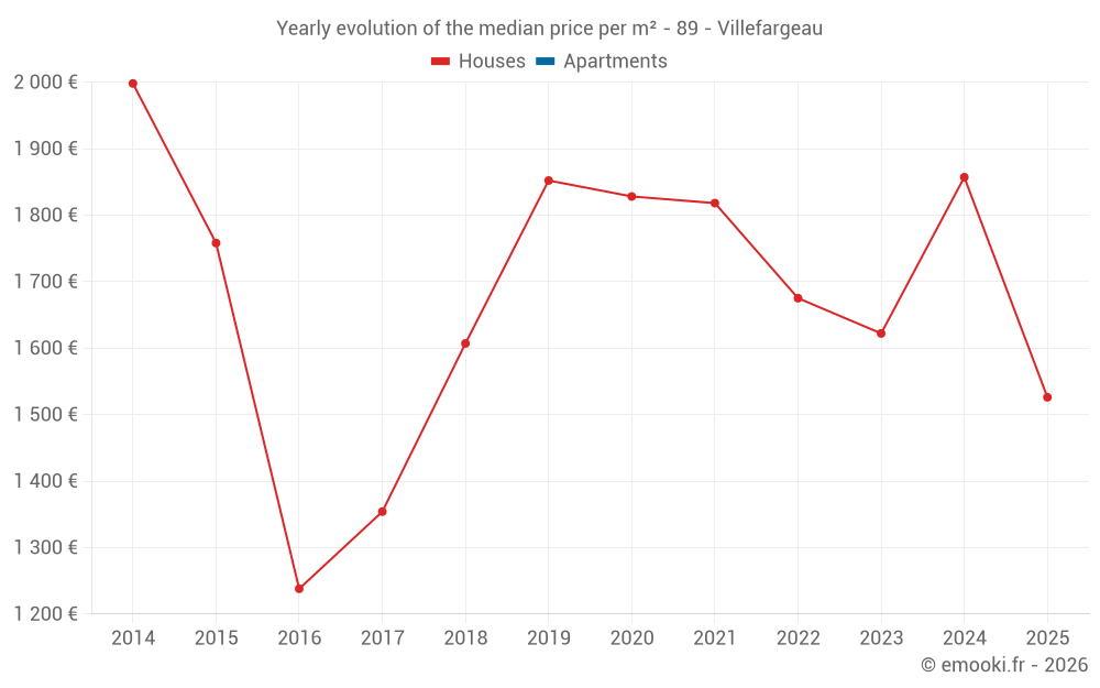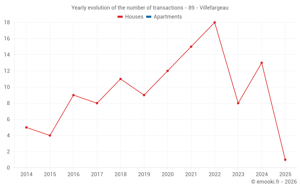 The median price on the 18 house transactions of the last 24 months in the municipality of Villefargeau was 1 825 € per square meter for a median property value of 177 100 €. Over this period, 60% of transactions were between 1 179 and 2 134 € per square meter (from the 2nd to the 8th deciles).