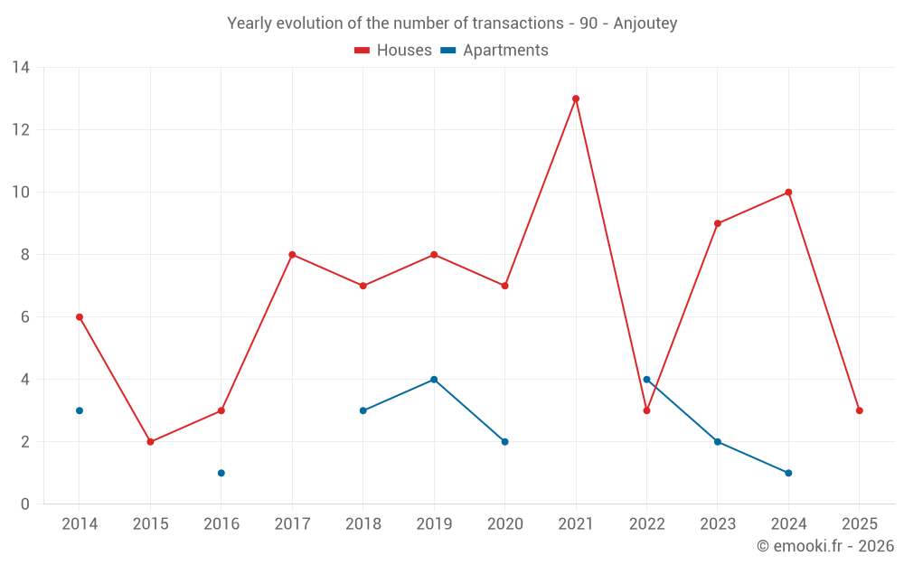 The median price on the 18 house transactions of the last 24 months in the municipality of Anjoutey was 1 705 € per square meter for a median property value of 156 050 €. Over this period, 60% of transactions were between 1 320 and 2 430 € per square meter (from the 2nd to the 8th deciles).