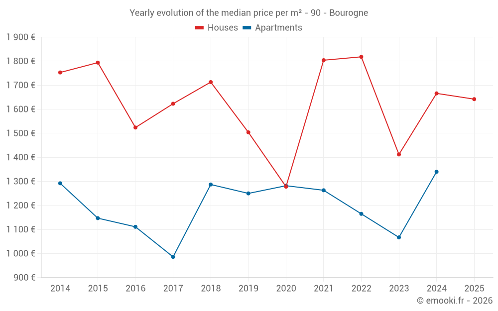 The median price on the 15 house transactions of the last 24 months in the municipality of Bourogne was 1 631 € per square meter for a median property value of 197 000 €. Over this period, 60% of transactions were between 1 401 and 1 962 € per square meter (from the 2nd to the 8th deciles).
