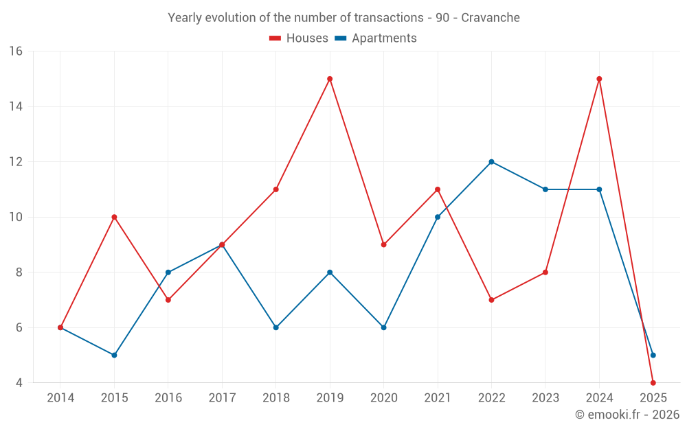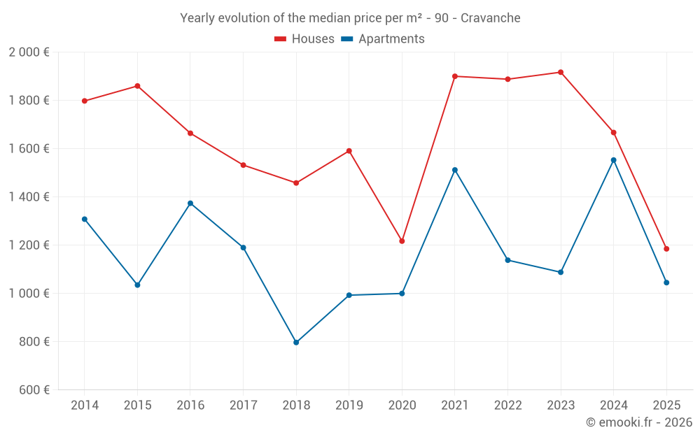 The median price on the 22 house transactions of the last 24 months in the municipality of Cravanche was 1 630 € per square meter for a median property value of 187 500 €. Over this period, 60% of transactions were between 1 319 and 2 082 € per square meter (from the 2nd to the 8th deciles).