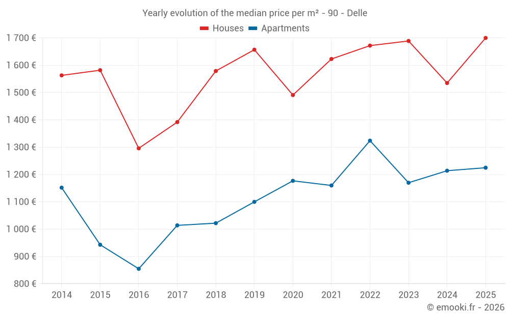 The median price on the 28 house transactions of the last 12 months in the municipality of Delle was 1 574 € per square meter for a median property value of 173 000 €. Over this period, 60% of transactions were between 1 234 and 2 210 € per square meter (from the 2nd to the 8th deciles).