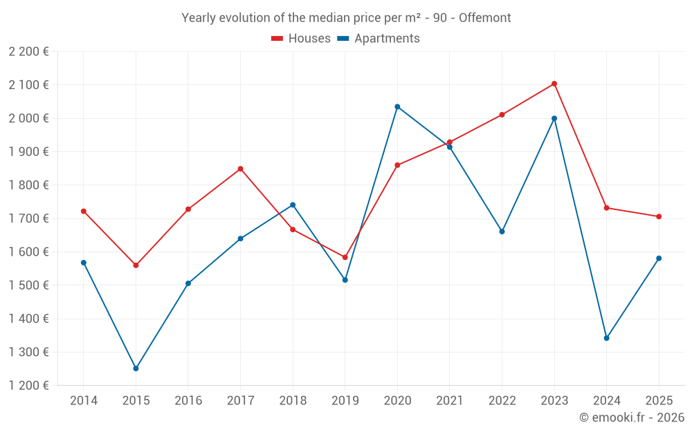 The median price on the 14 apartment transactions of the last 24 months in the municipality of Offemont was 1 602 € per square meter for a median property value of 88 500 €. Over this period, 60% of transactions were between 978 and 2 114 € per square meter (from the 2nd to the 8th deciles).