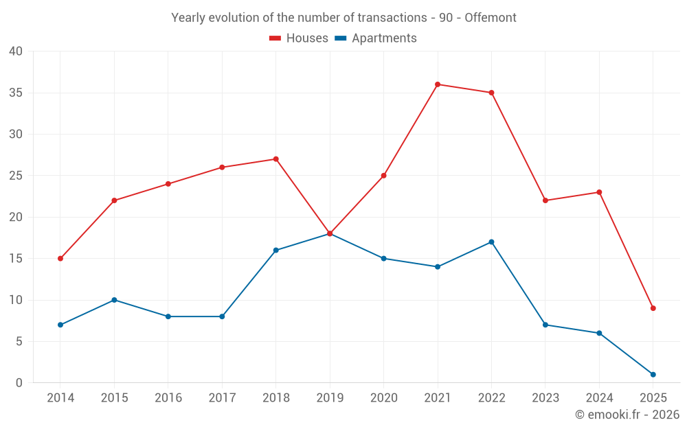The median price on the 28 house transactions of the last 12 months in the municipality of Offemont was 1 801 € per square meter for a median property value of 177 100 €. Over this period, 60% of transactions were between 1 069 and 2 430 € per square meter (from the 2nd to the 8th deciles).