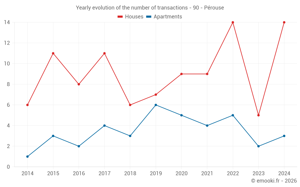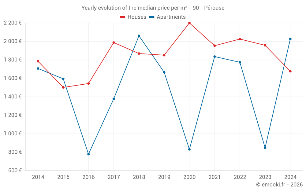The median price on the 17 house transactions of the last 24 months in the municipality of Pérouse was 1 751 € per square meter for a median property value of 205 400 €. Over this period, 60% of transactions were between 1 053 and 2 120 € per square meter (from the 2nd to the 8th deciles).