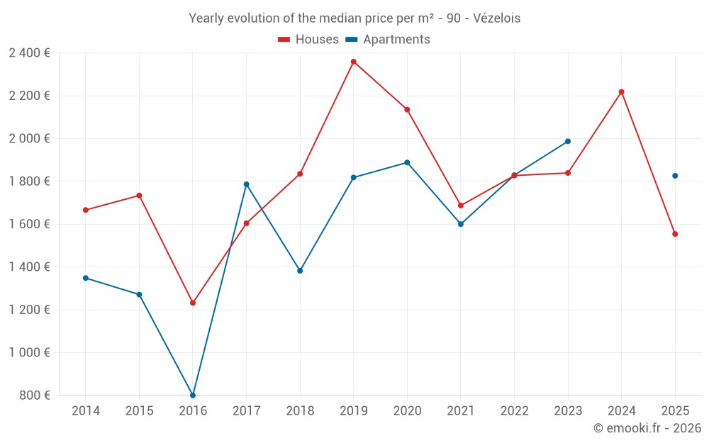 The median price on the 14 house transactions of the last 24 months in the municipality of Vézelois was 2 010 € per square meter for a median property value of 223 800 €. Over this period, 60% of transactions were between 1 560 and 2 365 € per square meter (from the 2nd to the 8th deciles).
