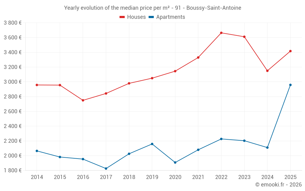 The median price on the 25 house transactions of the last 12 months in the municipality of Boussy-Saint-Antoine was 3 417 € per square meter for a median property value of 330 000 €. Over this period, 60% of transactions were between 2 776 and 4 104 € per square meter (from the 2nd to the 8th deciles).
