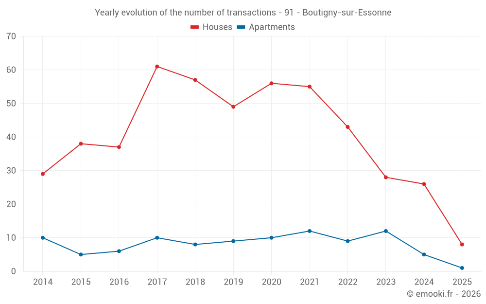 The median price on the 22 house transactions of the last 12 months in the municipality of Boutigny-sur-Essonne was 2 542 € per square meter for a median property value of 263 250 €. Over this period, 60% of transactions were between 2 090 and 3 205 € per square meter (from the 2nd to the 8th deciles).