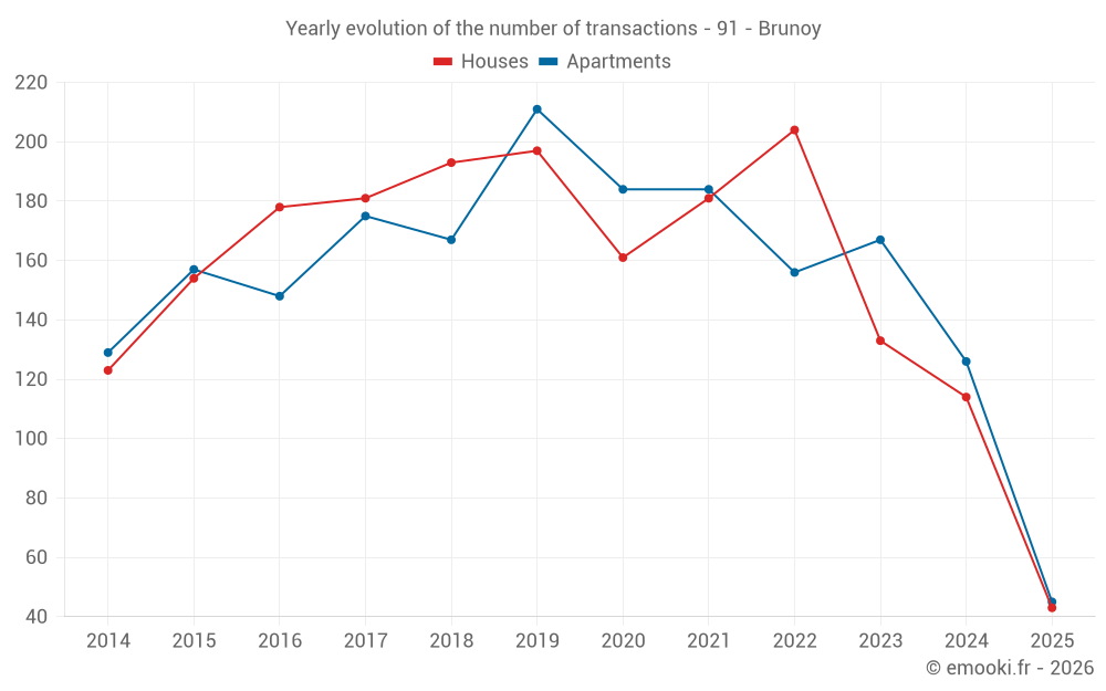The median price on the 45 apartment transactions of the last 6 months in the municipality of Brunoy was 3 014 € per square meter for a median property value of 196 000 €. Over this period, 60% of transactions were between 2 426 and 3 772 € per square meter (from the 2nd to the 8th deciles).