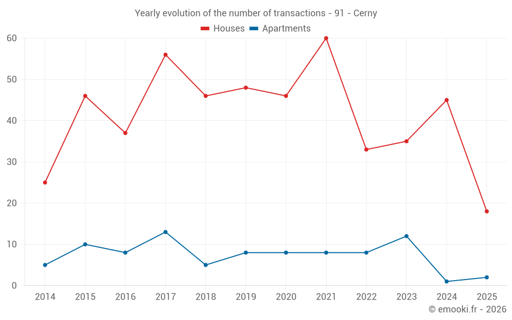 The median price on the 18 house transactions of the last 6 months in the municipality of Cerny was 3 627 € per square meter for a median property value of 252 550 €. Over this period, 60% of transactions were between 2 624 and 4 454 € per square meter (from the 2nd to the 8th deciles).