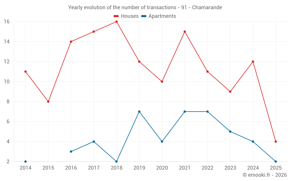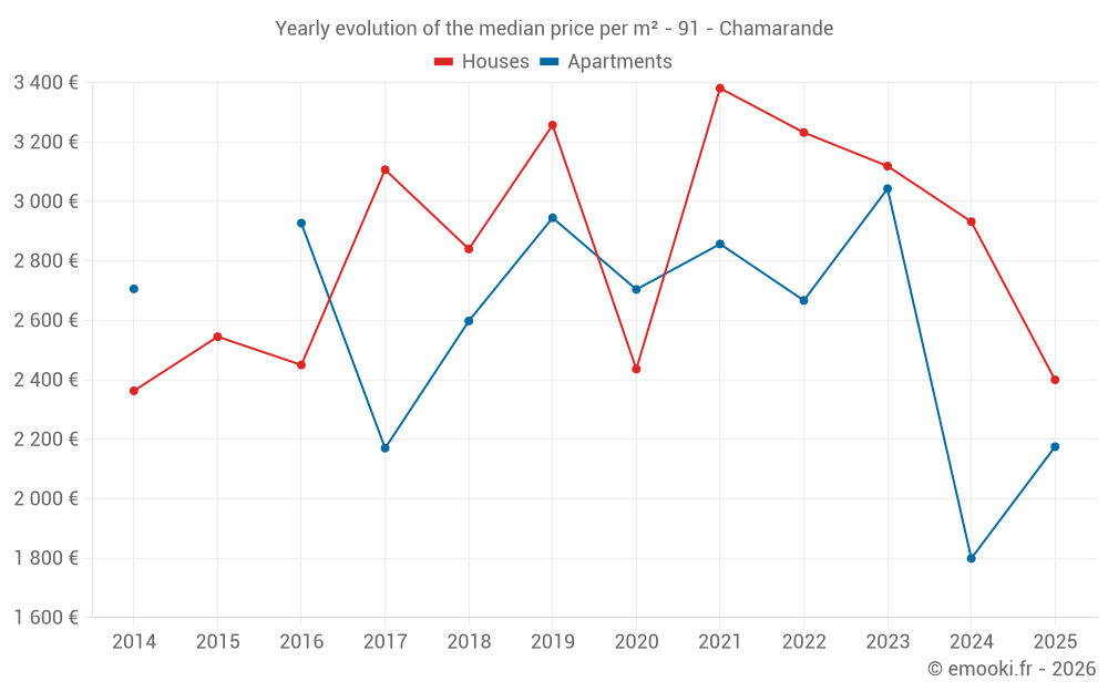 The median price on the 23 house transactions of the last 24 months in the municipality of Chamarande was 2 927 € per square meter for a median property value of 278 000 €. Over this period, 60% of transactions were between 1 933 and 3 345 € per square meter (from the 2nd to the 8th deciles).