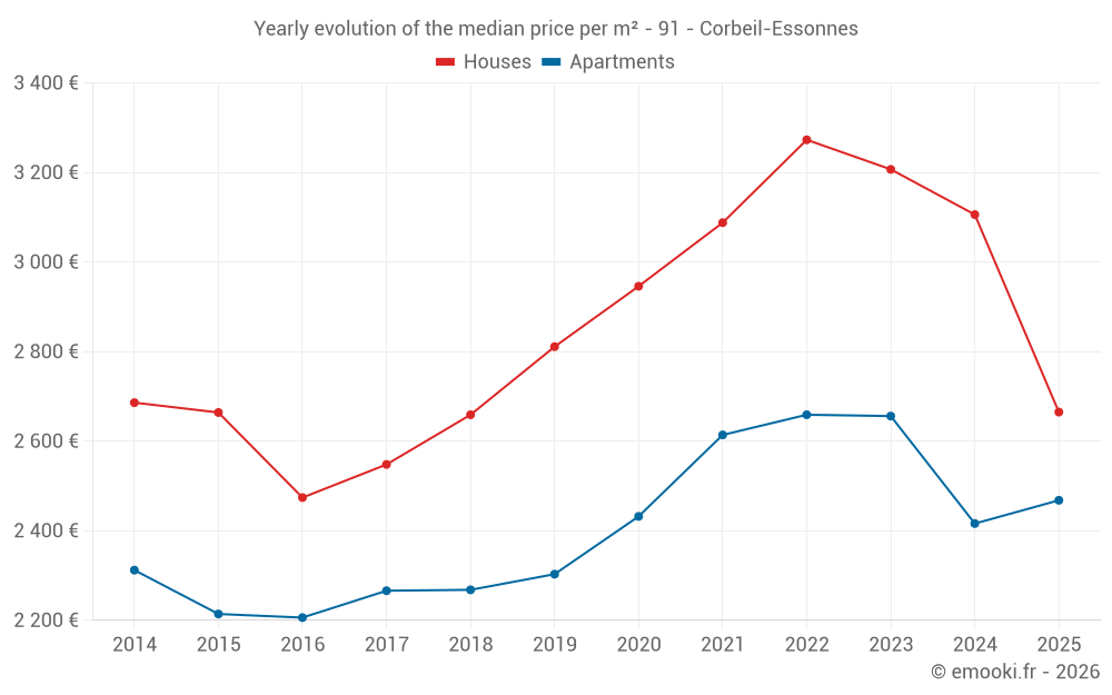 The median price on the 34 house transactions of the last 6 months in the municipality of Corbeil-Essonnes was 2 665 € per square meter for a median property value of 268 175 €. Over this period, 60% of transactions were between 2 015 and 3 337 € per square meter (from the 2nd to the 8th deciles).