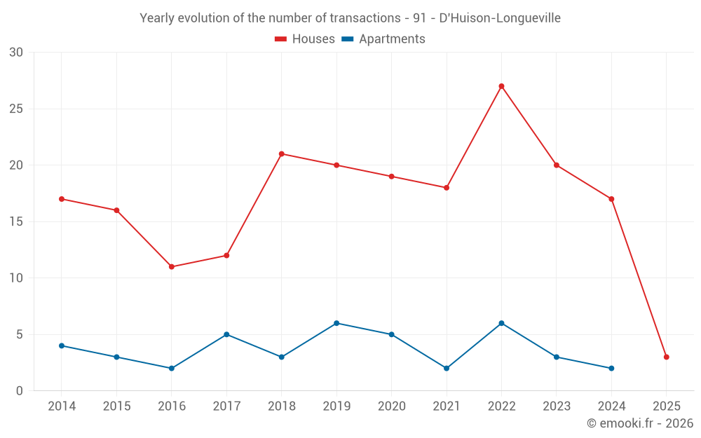 The median price on the 28 house transactions of the last 24 months in the municipality of D'Huison-Longueville was 3 138 € per square meter for a median property value of 267 000 €. Over this period, 60% of transactions were between 2 679 and 3 706 € per square meter (from the 2nd to the 8th deciles).