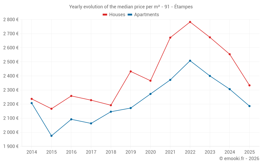 The median price on the 31 house transactions of the last 6 months in the municipality of Étampes was 2 333 € per square meter for a median property value of 240 000 €. Over this period, 60% of transactions were between 1 796 and 2 866 € per square meter (from the 2nd to the 8th deciles).