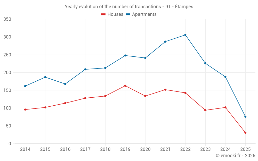 The median price on the 31 apartment transactions of the last 3 months in the municipality of Étampes was 2 280 € per square meter for a median property value of 106 000 €. Over this period, 60% of transactions were between 1 404 and 2 600 € per square meter (from the 2nd to the 8th deciles).