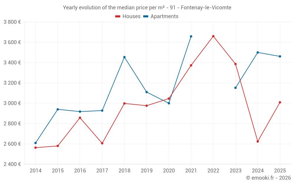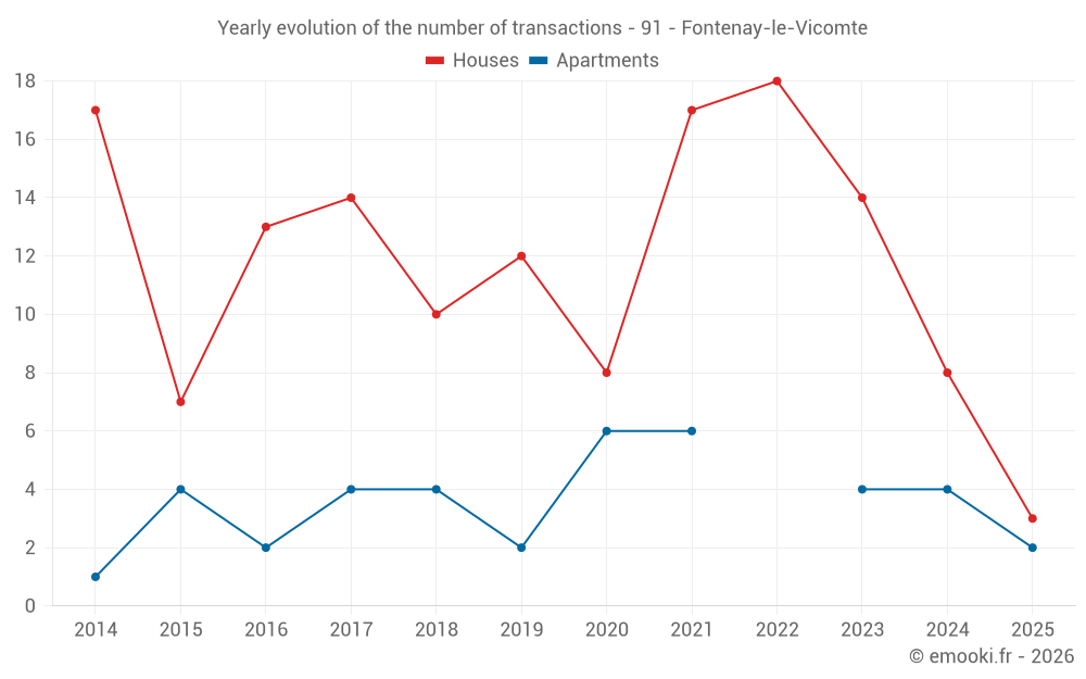 The median price on the 17 house transactions of the last 24 months in the municipality of Fontenay-le-Vicomte was 3 009 € per square meter for a median property value of 292 500 €. Over this period, 60% of transactions were between 2 317 and 3 494 € per square meter (from the 2nd to the 8th deciles).