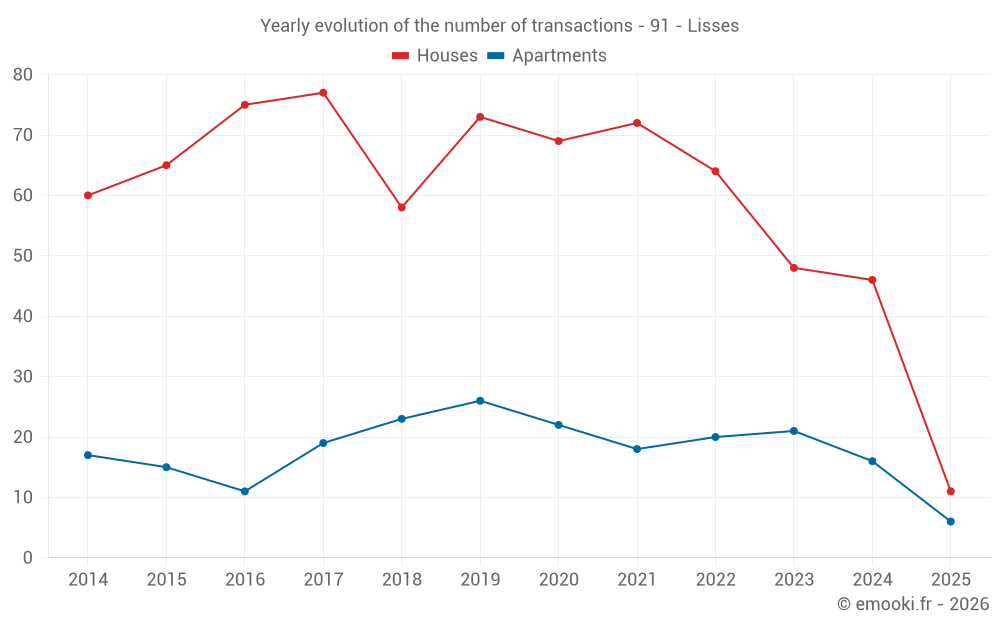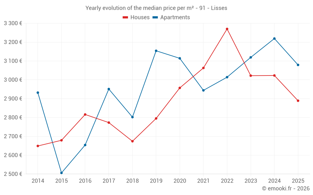The median price on the 35 house transactions of the last 12 months in the municipality of Lisses was 3 019 € per square meter for a median property value of 280 000 €. Over this period, 60% of transactions were between 2 526 and 3 510 € per square meter (from the 2nd to the 8th deciles).