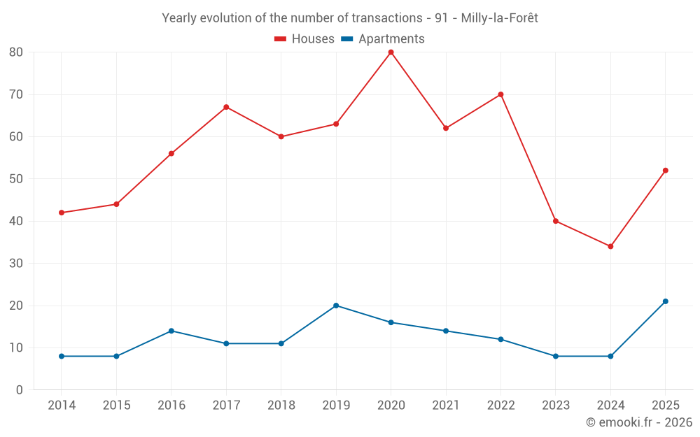 The median price on the 32 house transactions of the last 6 months in the municipality of Milly-la-Forêt was 3 106 € per square meter for a median property value of 307 000 €. Over this period, 60% of transactions were between 2 398 and 3 734 € per square meter (from the 2nd to the 8th deciles).