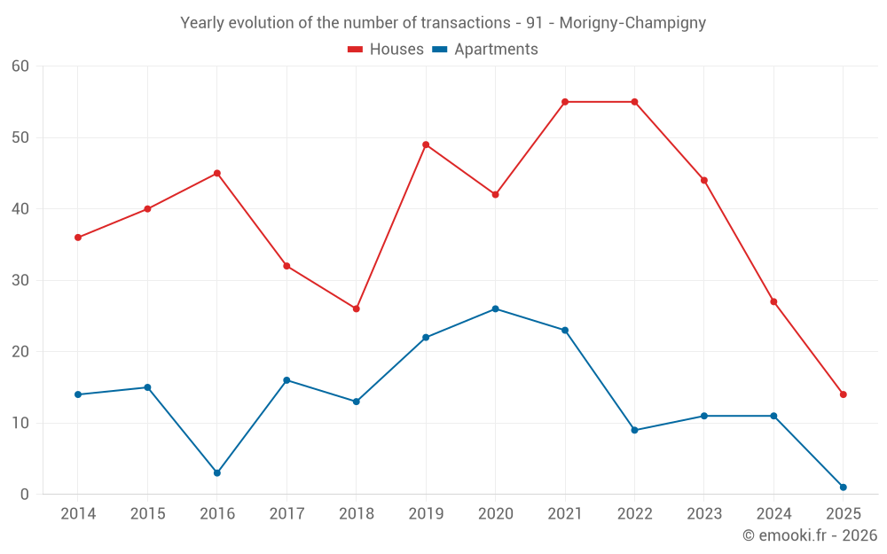The median price on the 31 house transactions of the last 12 months in the municipality of Morigny-Champigny was 3 023 € per square meter for a median property value of 280 000 €. Over this period, 60% of transactions were between 2 540 and 3 542 € per square meter (from the 2nd to the 8th deciles).