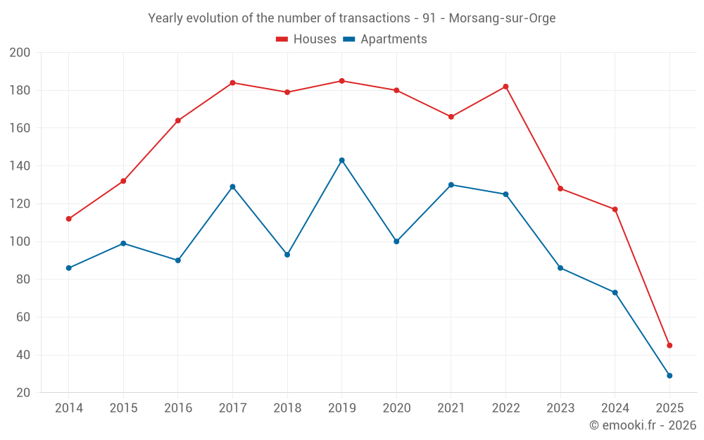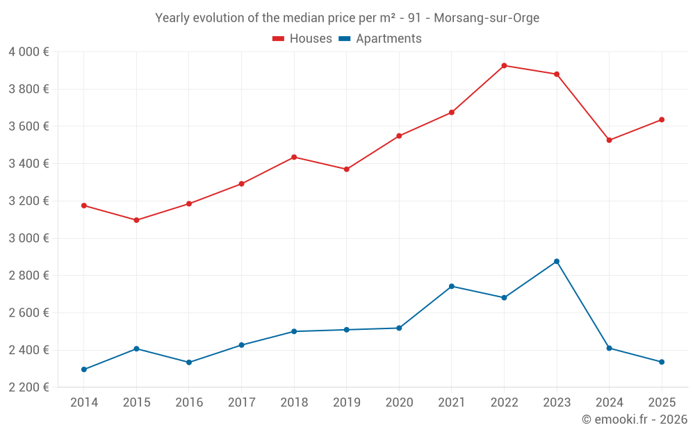 The median price on the 45 house transactions of the last 6 months in the municipality of Morsang-sur-Orge was 3 636 € per square meter for a median property value of 320 000 €. Over this period, 60% of transactions were between 2 943 and 5 078 € per square meter (from the 2nd to the 8th deciles).