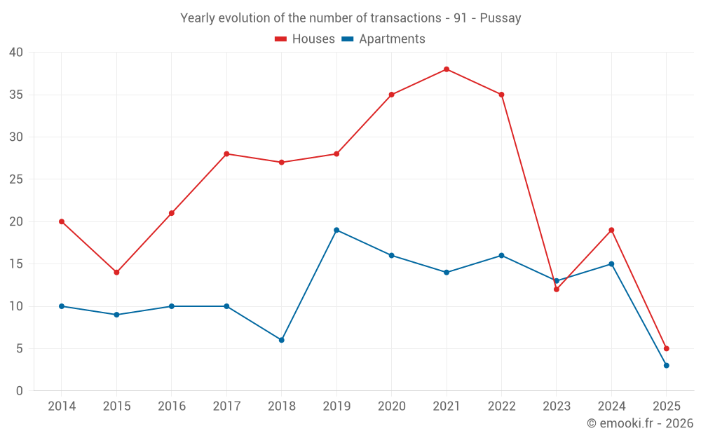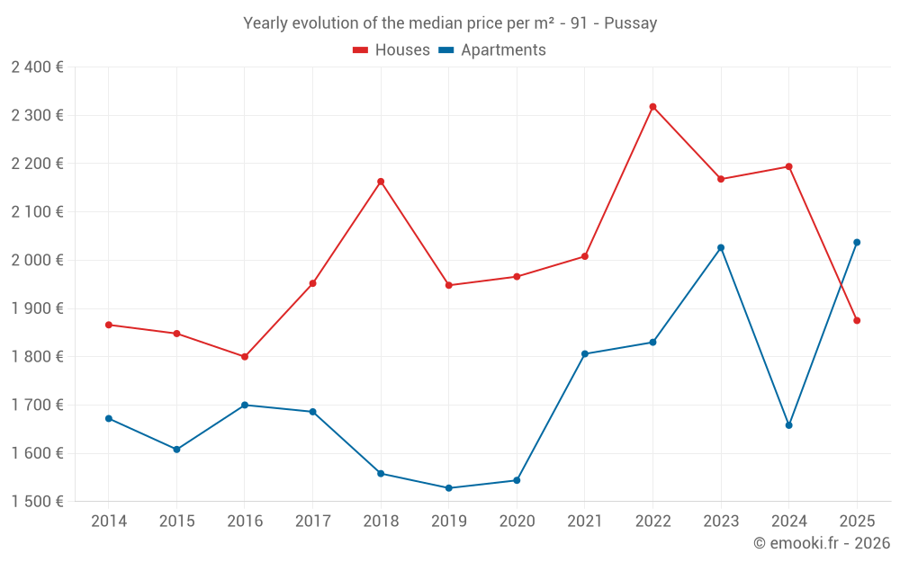 The median price on the 26 apartment transactions of the last 24 months in the municipality of Pussay was 1 995 € per square meter for a median property value of 83 920 €. Over this period, 60% of transactions were between 1 420 and 2 273 € per square meter (from the 2nd to the 8th deciles).
