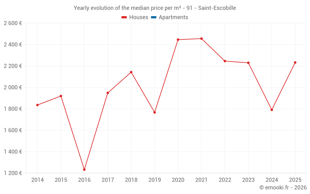The median price on the 18 house transactions of the last 24 months in the municipality of Saint-Escobille was 1 833 € per square meter for a median property value of 226 450 €. Over this period, 60% of transactions were between 1 134 and 2 518 € per square meter (from the 2nd to the 8th deciles).